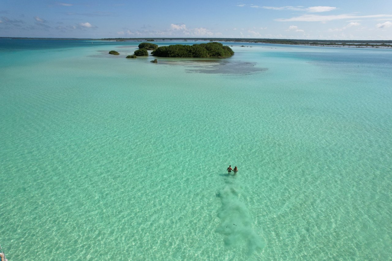 Pendant environ deux heures et demie, nous glissons sur les eaux cristallines de la lagune de Bacalar, célèbre pour ses sept nuances de bleu, créées naturellement par la profondeur, les fonds sableux et la lumière du soleil.